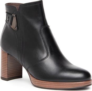 Logo-accented hardware stands out at the ankle strap of a rich leather bootie lifted by a stacked platform and half-moon block heel.