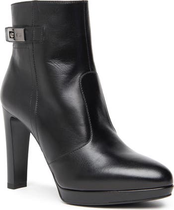 Logo-etched hardware at the ankle intensifies the signature elegance of this smooth leather platform bootie crafted in Italy.