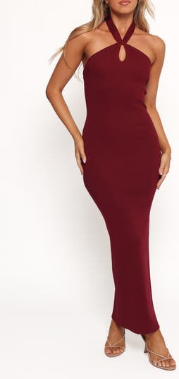 A halter neck with a dainty keyhole amplfies the date-ready allure of this lightweight sweater-dress knit in a ribbed body-con silhouette.