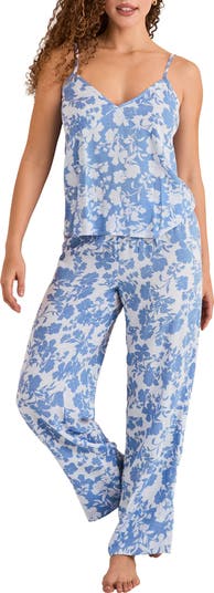 Soft, lightweight pajama set with a relaxed fit. Features a V-neck camisole with adjustable straps and matching pants in a delicate blue floral print—perfect for comfortable, effortless lounging.