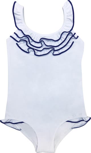 Embrace timeless elegance with this beautifully understated one-piece swimsuit. Set on a canvas of pristine white, this suit is the epitome of classic seaside style. A cascade of tiered ruffles frames the scoop neckline, with each delicate layer traced by a crisp navy blue trim that provides a sophisticated, nautical contrast.