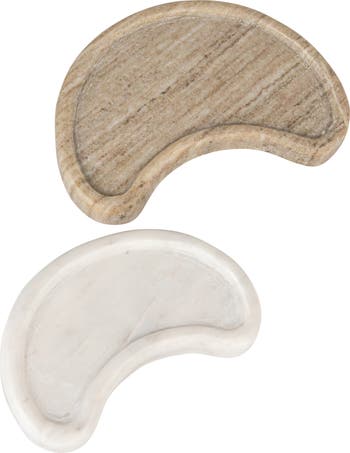 - A pair of nestable kidney-shaped trays, showcasing a smooth buff and white marble finish for a touch of organic elegance