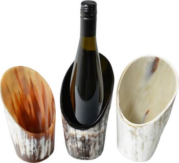 Show off your favorite wine bottle with this elegant Nestled Horn Wine Holder that artfully displays your wine bottle at at your bar or tabletop. Perfect for displaying the current bottle of choice, this open wine bottle holder is sure to be a conversation starter at your next dinner party. This unique, hand-crafted horn product is sustainably made from the horns of the Ankole-Watusi, or Ankole Longhorn, a breed of cattle native to western Uganda and parts of East Africa. These distinctive horns are a recycled byproduct of the food industry and are purchased directly from the cattle keepers, providing revenue for local cattle keeping communities. The horn is then hand carved and polished according to Maadili designs by a small scale artisan community.