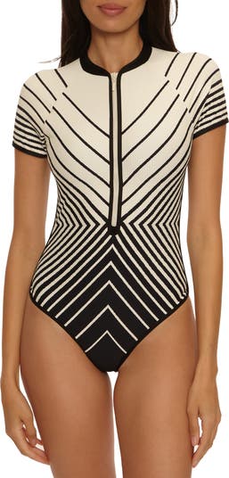 Net-inspired stripes stand out on the ribbed fabric of this zip-front one-piece swimsuit framed by short sleeves that offer extra protection from the sun, sand and surf.