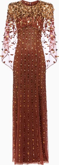 This stunning gown is a masterclass in opulence, featuring intricate beadwork and elaborate embellishments that create a truly striking and luxurious appearance. The long, sheer sleeves, delicately adorned with fine detailing, impart an ethereal quality, enhancing the gown's overall elegance. The fitted silhouette elegantly contours the body, emphasizing a refined and sophisticated profile. A rich bronze hue is beautifully highlighted by shimmering gold accents, adding depth and radiance to the design.