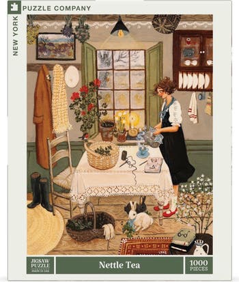 Anytime is the perfect time for tea! This cozy scene illustrated by Loré Pemberton invites you into a quaint kitchen, where the warmth of a pot of tea welcomes you in from the cold. A gardener, having just finished pruning nettle leaves, enjoys the comfort of a home, filled with dried herbs, flowers, and vibrant indoor plants. Each piece of this puzzle captures the serene beauty of a rustic, nature-inspired haven.