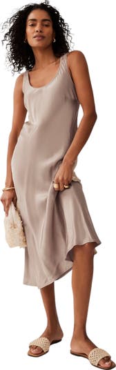 Neutral satin slip dress featuring a scoop neckline, scoop back in a bias cut.