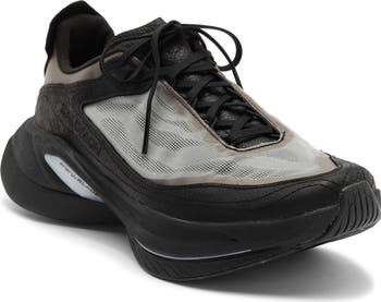 Upper: Mesh-jacquard insets provide ventilation, while textured leather frames the futuristic design.
