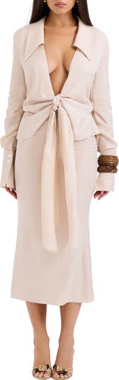 Turn heads in this deconstructed shirtdress designed with a luxurious drape and updated with a daring open front.