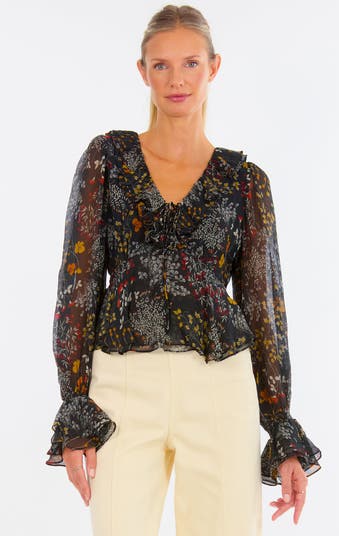 Secret Mission’s Neveah Top is crafted from 100% organic silk chiffon, designed in the Wildflower print. This romantic blouse features a deep V-neckline, front tie closure, and flared sleeves with soft ruffle trims. This piece brings a graceful silhouette that blends vintage charm with modern ease.