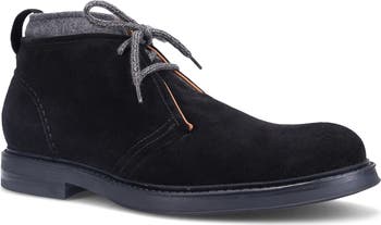 A flannel collar and water-resistant suede upper add comfortable elements to an Italian-made boot featuring premium underfoot cushioning and a slip-resistant rubber sole.