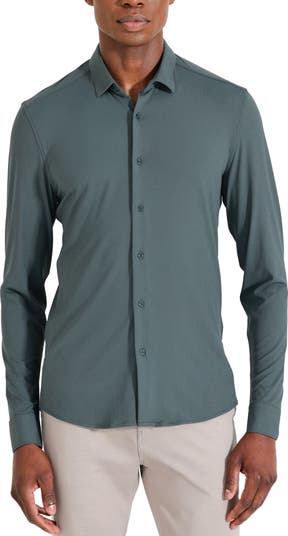 Long sleeve slim shirt in a nylon-spandex blend. Features classic collar, button closure and clean, modern finish.