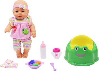 - ADORABLE DOLL FOR BIG ADVENTURES - Dressed in a striped outfit with an adorable headband, this realistic-looking potty training doll is perfect for creating special memories. Includes bottles, bib, feeding plate, play food, spoon, and fabric diaper
