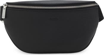 Debossed logo hardware glints against the pebbled leather exterior of a voluminous belt bag featuring multiple pockets and suspended from an adjustable webbing strap.