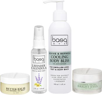 Cucumber Tea Eye Gel: Water (Aqua), Glycerin, Polysorbate 20, Corallina Officinalis (Seaweed) Extract, Yeast Extract, Organic Camellia Sinensis (Green Tea) Leaf Extract, Organic Centelilla Asiatica Extract, Organic Cucumis Sativus (Cucumber) Fruit Extract, Organic Rosa Damascena (Rose) Flower Water, Organic Oryza Sativa (Rice) Extract, Hydrolyzed Soy Protein, Menthol, Propanediol, Xanthophyll, Polyquaternium 7, Hydroxyethylcellulose, Sodium Hydroxide, Acrylates/C10-30 Alkyl Acrylate Crosspolymer, Phenoxyethanol, Caprylyl Glycol, Yellow 5, Blue 1 Cooling Body Bliss: Water, Aloe (Barbadensis Leaf Juice), Cucumber (Cucumis Sativus) Fruit Extract, Green Tea (Camellia Oleifera) Leaf Extract, Eucalyptus (Globulus Leaf) Oil, Lavender (Lavendula Officinalis), Sandalwood (Santalum Album), Menthyl Lactate, Menthol, Fragrance, Disodium Edta, Propylene Glycol, Acrylates/C 1O-30 Alkyl Acrylate Crosspolymer, Triethanolamine, Phenoxyethanol, Polysorbate 20, Capryl Glycol, Potassium Sorbate, Hexylene Glycol.Calendula Lavender Mist: Water, Leuconostoc/Radish Root Ferment Filtrate, Propanediol, Organic Calendula Flower Extract, Poppy Seed Oil, Coconut Water. Better Balm: Grapeseed Oil, Beeswax, Lavender Flower Essential Oil, Vitamin E, Sunflower Seed Oil, Jojoba Seed Oil, Shea Butter, Rosehip Seed Oil, Meadowfoam Seed Oil, Calendula Flower Oil, Olive Oil, Tea Tree Leaf Oil, Roman Chamomile Oil, German Chamomile Flower Oil