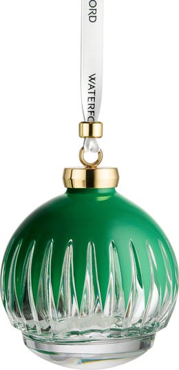 Bring the joy of celebration and the promise of new beginnings into your home with this intricate bauble ornament made from light-catching, green crystal. The ornament is suspended from a branded ribbon with a dated goldtone cuff.