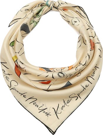 Playful hand-drawn lettering and colorful motifs bring lively charm to this square silk scarf that can be styled at the neck or tied to your favorite handbag.