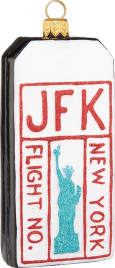 Book your plans for a festive season when you add this glitter-dusted blown-glass ornament to your holiday decorations.