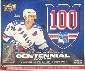 2025-26 Upper Deck New York Rangers Centennial Box Set celebrates the 100-year history (1926-2026) of the storied Original Six franchise and delivers (1) Complete 100-Card Base Set featuring legendary New York Rangers players, as well as (5) Parallel or Insert Cards in Every Boxed Set!