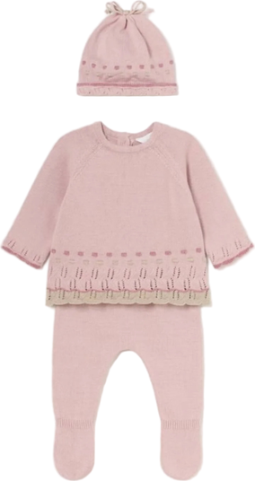 - Three-piece baby outfit set in soft pink