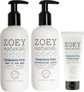 Care for your baby's delicate skin with this simple, fragrance-free routine designed to gently cleanse, moisturize, and protect newborn skin. Thoughtfully curated for sensitive newborn skin, this essential set helps support comfort and hydration while keeping daily care easy for parents. With gentle formulations and natural, effective ingredients, these everyday essentials help maintain soft, healthy-looking skin from bath time to diaper changes. Set Includes: | Fragrance Free Head to Toe Wash: A gentle, fragrance-free cleanser designed for delicate skin and hair, leaving baby clean and comfortable without irritation. Tear-free, gentle pH, sulfate-free, and plant-based. | Fragrance Free Moisturizing Lotion: A lightweight pediatrician and dermatologist approved moisturizer that helps keep delicate skin soft, smooth, and hydrated throughout the day. | Fragrance Free Diaper Cream: A pediatrician and dermatologist approved diaper cream formulated with non-nano zinc oxide to treat and prevent diaper rash, shea and cocoa butter to soothe and nourish delicate skin, and avocado oil to prevent and relieve dryness.