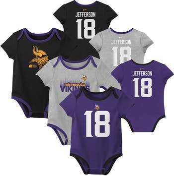 Give the newest member of your family a head start on their Minnesota Vikings fandom with this Justin Jefferson Three-Pack Name and Number Bodysuit Set from Nike. Lap shoulder necklines and snap closures make dressing your little one a breeze, while the contrast-color binding adds a touch of style. This three-pack of bodysuits ensures your newest fan is ready to show their team spirit from the very first snap.