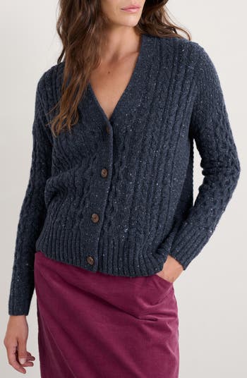 Cozy cable stitching enhances the texture and warmth of this chunky V-neck cardigan knit from a luxurious merino-wool blend.
