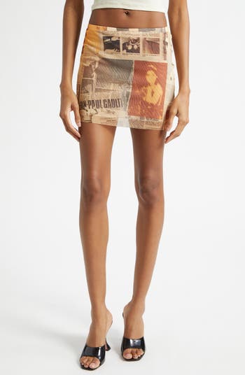 JPG rewrites the rules of branding with this figure-flaunting mesh miniskirt patterned in newspaper clips celebrating the iconoclastic designer's 'extra, extra!' career.