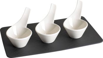 Contemporary chic- The New Wave collection by Villeroy & Boch adds fluidity and style to your table with clean lines and original eye-catching designs. Made in Germany from high-quality porcelain, the unique contemporary collection will elevate your special occasions and everyday dining. The four- piece set includes a rectangular serving plate, and 3 handled dip bowls. Earn yourself a little more leisure time with dishwasher safe durability and microwave safe convenience. High-quality German-made porcelain provides upscale appeal and lasting durability. Villeroy & Boch has been a premium manufacturer of fine porcelain, glassware, flatware, and more since 1748.