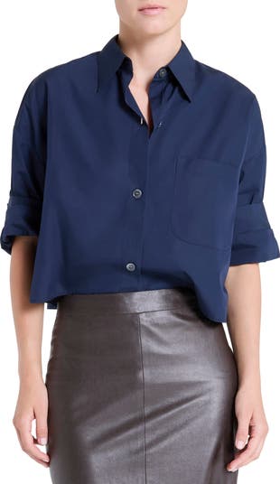 A boxy cropped silhouette brings modern ease to this crisp button-up blouse fashioned in smooth cotton with a sharp point collar.
