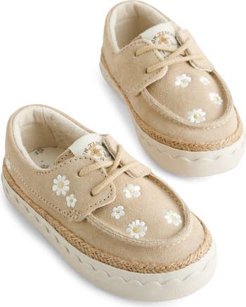 A whimsical boat shoe is scaled-down for kids in this suede version featuring floral embroidery, a scalloped midsole and slip-resistant sole.