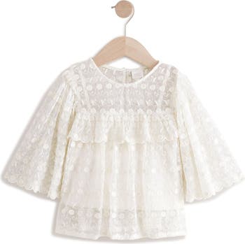 Your child will want to twirl endlessly in this graceful angel-sleeve top made from airy mesh lace embroidered with flowering vines.
