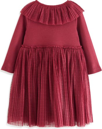 Mixed textures add to the appeal of this kid-size dress featuring pleated tulle ruffles at the neckline and skirt.