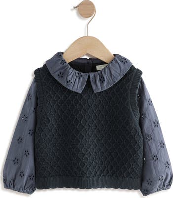 Your little one will look adorable in this diamond-patterned cotton sweater-vest that features an embroidered-eyelet collar and sleeves for a no-fuss, no-bulk layered look.
