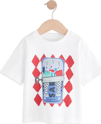 Cozy sardines resting in a rolled-back tin bring something fishy to the front of a T-shirt made for kids who like to play and relax in the delicious comfort of cotton.