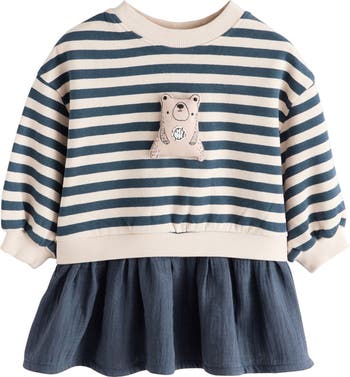 A 3d bear appliqué hitches a ride on a striped and comfy split-back sweatshirt dress that's contrasted with a gauzy skirt.