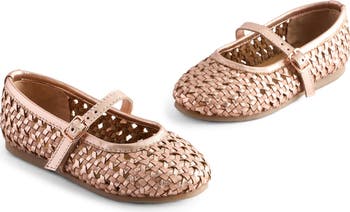 Finely woven metallic leather adds luster and dimension to a photo-ready flat designed with an adjustable mary jane strap for a secure fit.