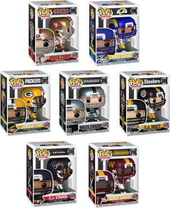 NFL Series 14 Funko Pop! Complete Set (7). Includes Brock Purdy (San Francisco 49ers), Puka Nacua (Los Angeles Rams), Jordan Love (Green Bay Packers), Maxx Crosby (Las Vegas Raiders), T.J. Watt (Pittsburgh Steelers), C.J. Stroud (Houston Texans), Deebo Samuel (Washington Commanders). Each vinyl figure measures approximately 4.0 inches tall and each comes packaged in a Funko Pop window display box.