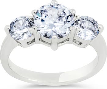 This classic three-stone ring centers a brilliant cubic zirconia flanked by two smaller stones for balanced sparkle. Set on a thin polished band, it delivers a luxurious, elevated look with timeless appeal.