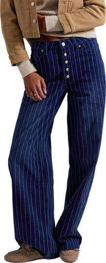 A laid-back, borrowed-from-the-boys fit gives these pinstriped jeans their effortless cool, complete with an exposed-button fly and a slouchy straight-leg silhouette in nonstretch cotton.