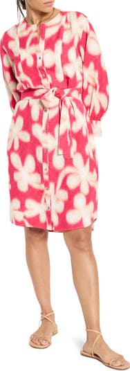 A true shirt-style silhouette marks this long-sleeve dress patterned in a scaled-up, glowing floral print and simply styled with a waist-cinching sash.