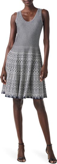 This favorite sweater-dress gets a graphically sharp update with a textured jacquard knit that perfectly highlights with the twirly flared skirt.