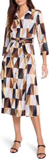 A blocky grid patterns this belted shirtdress cut from comfortable stretch cotton with cuffed three-quarter sleeves and a spread collar.