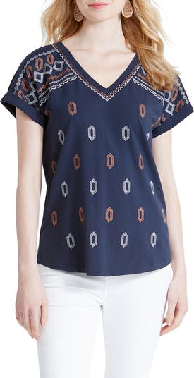 Embroidered accents bring a boho-chic vibe to this easygoing, stretchy knit T-shirt designed with a V-neck and cuffed short sleeves.