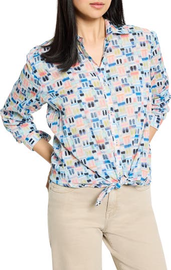 A blurry geometric design fades in and out on a button-up shirt made from rumpled-texture cotton in a modern, easy-fitting silhouette.