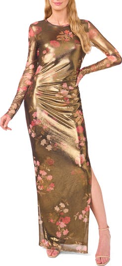 Steeped in shimmer and splashed with signature blooms, this gilded dress hugs your curves and wows the room.