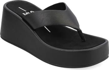 A chunky platform and lofty wedge heel bring dramatic height to a faux-leather flip-flop featuring a contoured footbed for a customized feel.