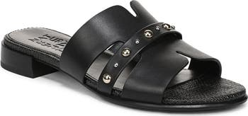 Mixed-metal studs and geometric cutouts add an edgy aesthetic to a leather slide sandal featuring premium underfoot cushioning for enhanced flexibility and shock absorption.