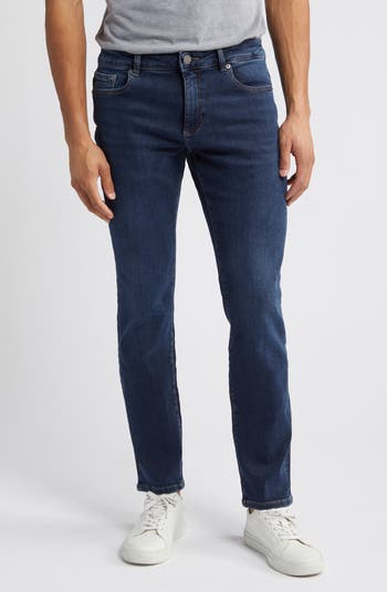 Subtle fading burnishes the worn-in blue wash of jeans made with recycled cotton with a true slim fit and a touch of stretch for easy comfort.