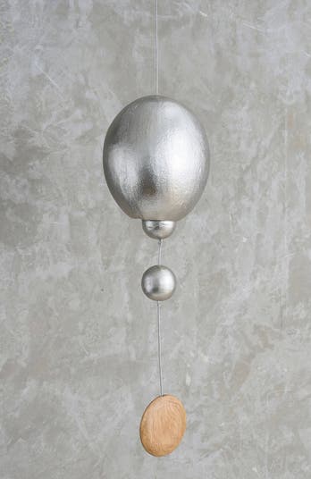 Substantial Cast aluminum bells feature a pair of metal spheres as clappers, and strung on a wire cord. This large, gently rounded metal bell features a disc-shaped oak sail to catch the breeze. Choose from the nickel or antique brass finishes.